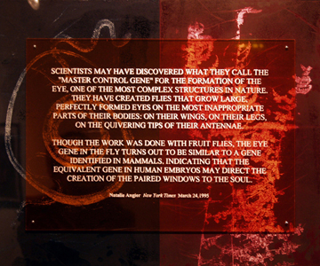 The Sleep of Reason: A Cautionary Tale suggests the dangers of the journey into the unknown territory of genetics, with its unparalleled capacity to manipulate nature on the cellular level. The cautions refer to our potential for changing the foundation of the natural world, by the unraveling of DNA and its subsequent genetic anomalies, in a way which supersedes even the eons represented by the Burgess Shale. The title is from an etching by Goya, from his Caprichos of 1799. In it, strange, monstrous forms appear out of nowhere, as the dreamer's "reason" is suspended in sleep. Natural forms like the human hand, a withered fern, jellyfish, or the significant predictability of a snake's coils are connected to scientific instruments and reflections from cultural texts. The sounds encircle the space, in an extended experience. In Richard Cornell's audio, sound gathered from field and studio recordings is filtered to reveal aspects beyond the scope of natural hearing. Sources include local crickets, the tree frog (Hyla versicolor), and the echo location signals of the silverhaired bat (Pipistrella). This presentation was at Hafnarfjordur Museum in Iceland, 2005.